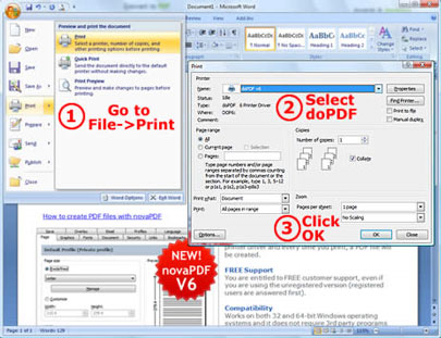 Mở một tài liệu (với Microsoft Word, WordPad, Notepad hoặc bất kỳ phần mềm nào khác), lựa chọn Print và chọn doPDF. Khi hoàn tất, nó sẽ hỏi bạn nơi để lưu các tập tin PDF, các tập tin PDF sẽ tự động được mở bởi một chương trình xem PDF mặc định của bạn.