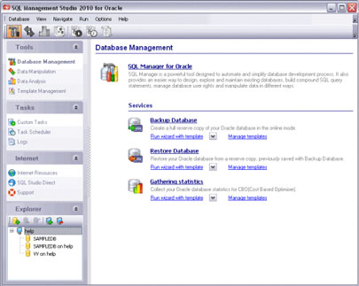 SQL Management Studio 2010 for Oracle là một giải pháp hoàn chỉnh để quản lý và phát triển cơ sở dữ liệu Oracle. Nó giúp bạn quản lý cơ sở dữ liệu Oracle, quản lý cơ sở dữ liệu lược đồ và các "đối tượng" khác cũng như thiết kế và so sánh cơ sở dữ liệu Oracle.